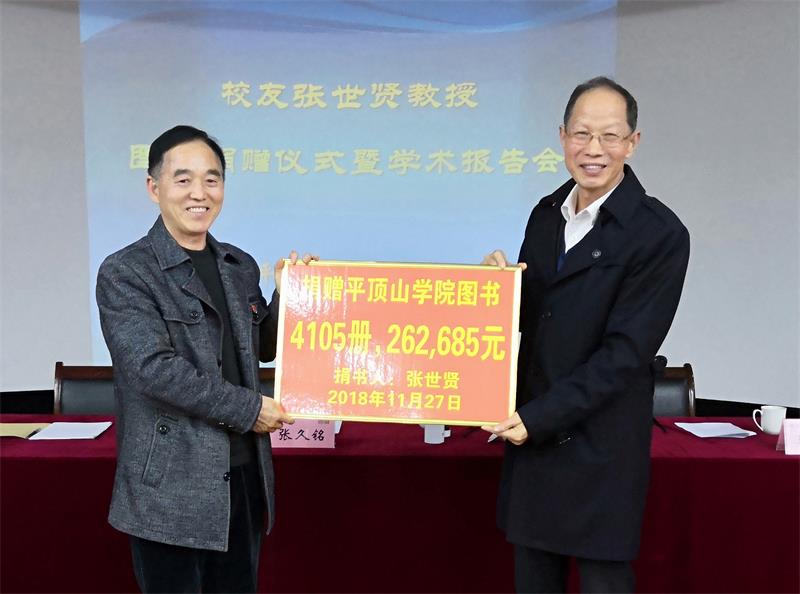 张久铭高度评价了张教授取得的卓著成绩,对其始终不忘母校、积极回报母校的情怀表示感谢。张世贤教授再次向母校捐赠了4105册图书,为丰富我校图书馆馆藏发挥了积极作用。张久铭代表学校接受赠书,并为其颁发捐赠证书。