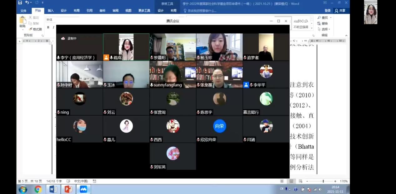 2021年11月11日,太阳成集团tyc7111在腾讯会议上组织召开了2022年国家社科基金项目申报论证会,会议邀请了河南省社科专家河南工业大学孙中叶教授、河南师范大学杨玉珍教授进行线上指导。