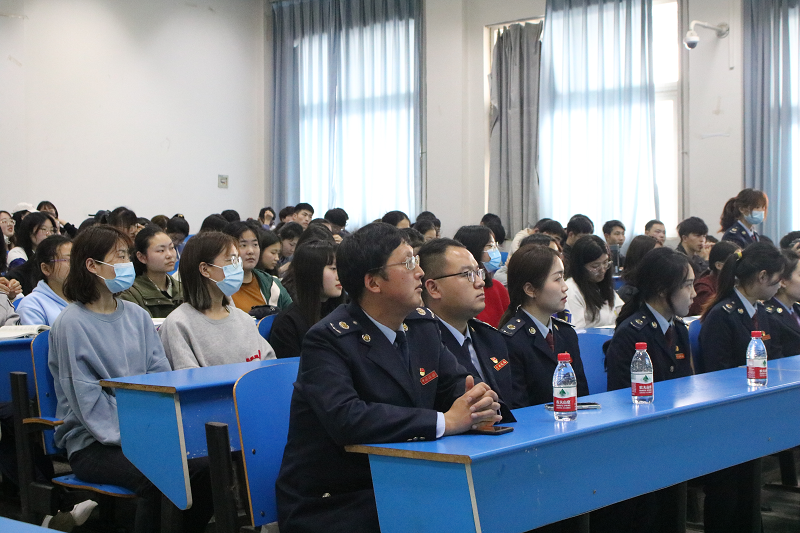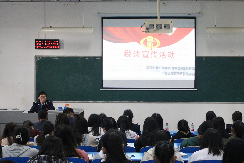 为进一步贯彻落实“减税费优服务、助复产促发展、打虚开防诈骗、话税收避风险”大走访活动,引导青年学生学习税收知识,增强税收风险防范意识,4月22日,tyc7111cc太阳成集团纳税人学校“税法大讲堂”在1106教室开讲。来自国家税务总局平顶山市湛河区税务局的工作人员、太阳成集团tyc7111部分教师、学生代表聆听讲座。