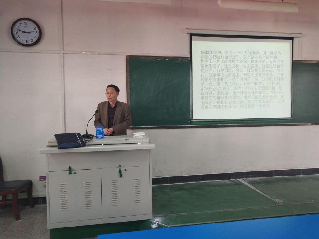 孔教授对近几十年来中国发展理念做了回顾总结,通过文化视角来反应人们对改革开放的心声和期盼,主讲了在70年代末、80年代初对改革开放后思想自由的欢欣鼓舞。并且对每个时期所对应的社会背景进行了详细的分析。通过富有时代特征的歌曲作品使大家感受到文化在社会历史进程中推动时代变革和陶冶人们情操的巨大作用。整场讲座风趣幽默,紧扣时代脉搏,声情并茂,同学们穿越历史时空,接受艺术的洗礼,感受时代的变迁。