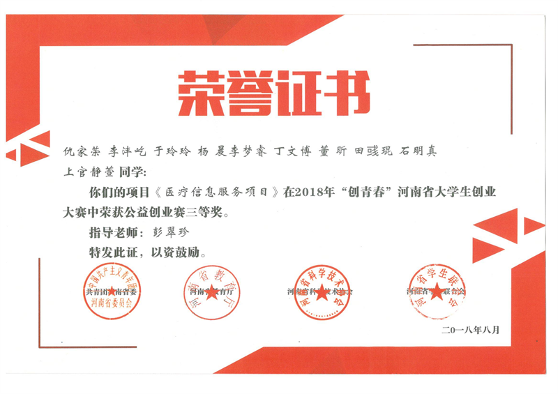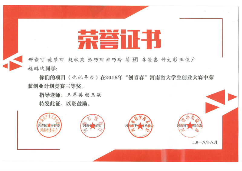 近日,我院学生参赛的三个项目在2018年“创青春”河南省大学生创业大赛上均获得三等奖。