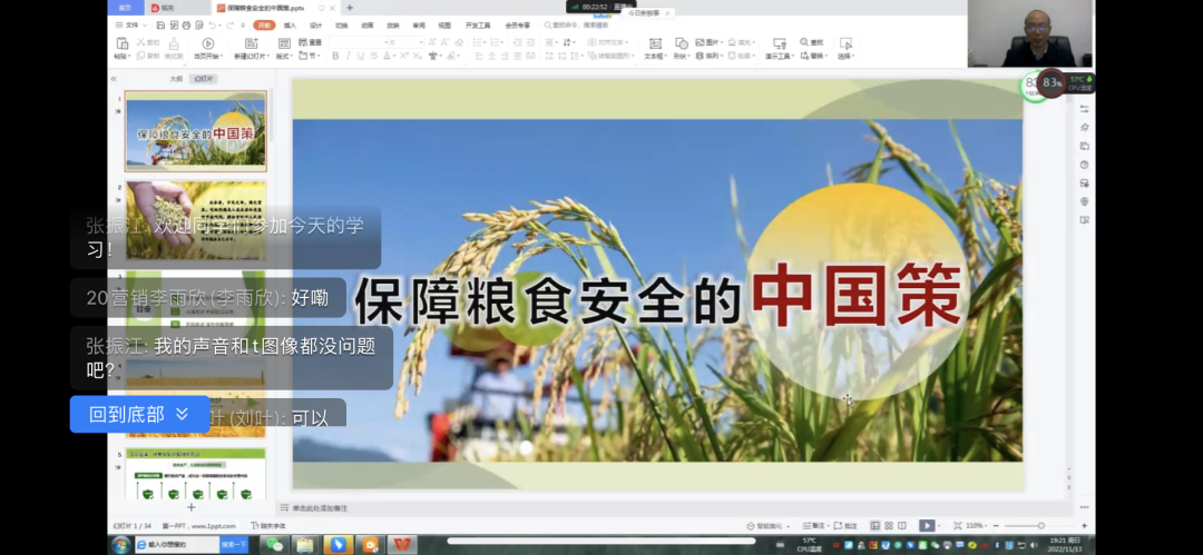 11月12日、13日晚,院长张振江以线上形式进行“确保粮食安全的中国策略”形势与政策专题讲座。