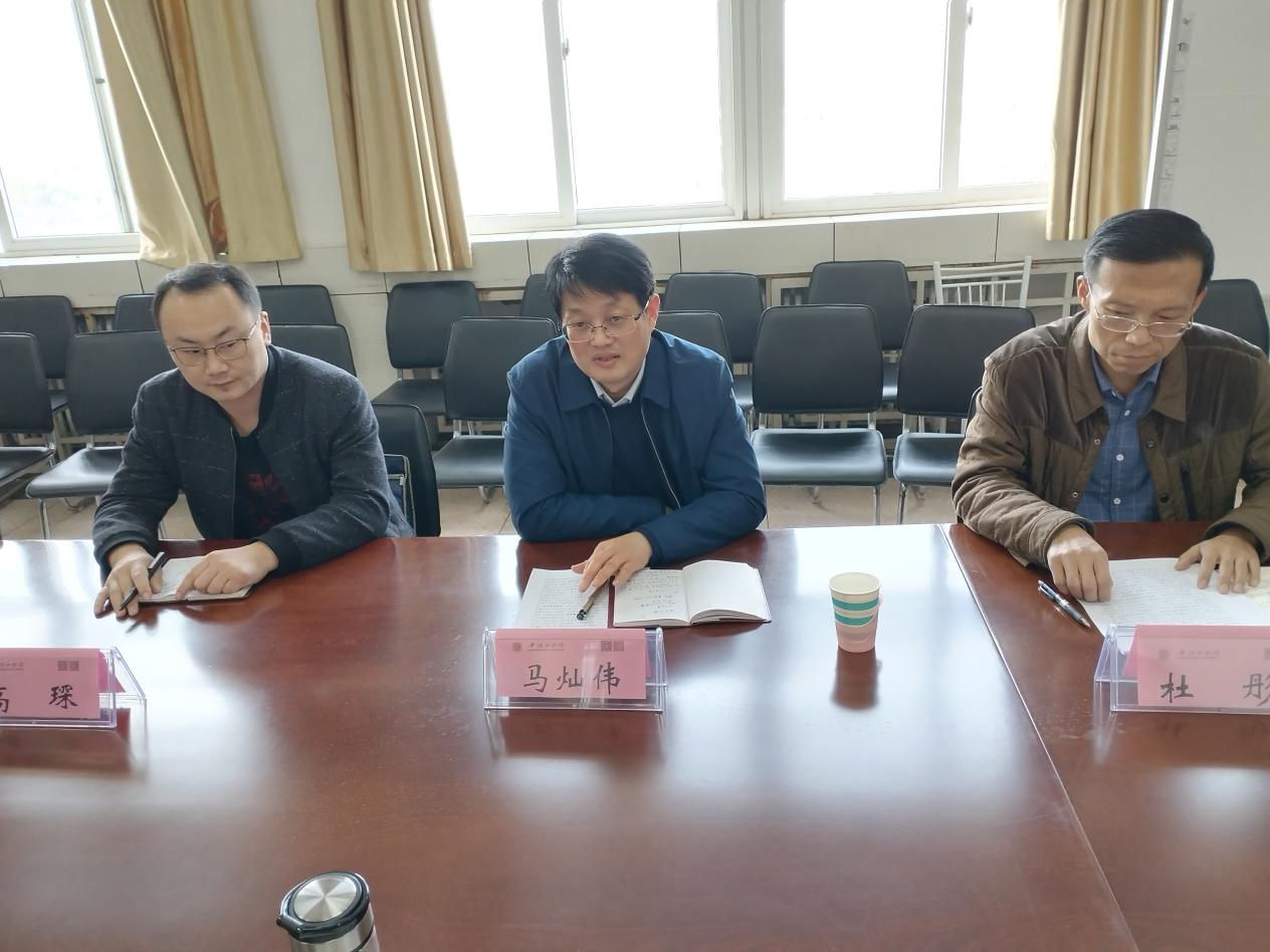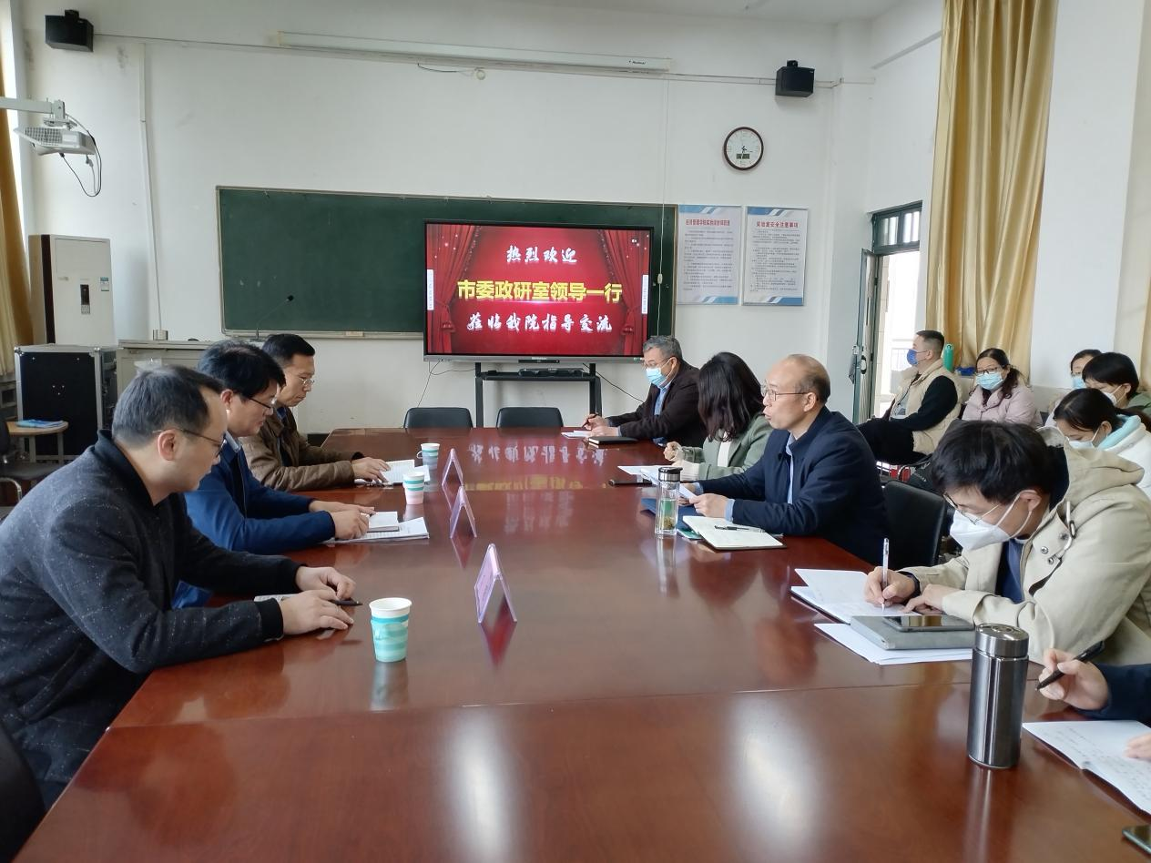 2023年3月2日下午,平顶山市委政研室副主任马灿伟、调研一科科长杜彤、调研二科科长高琛一行来到太阳成集团tyc7111,就如何服务政府决策咨询事宜举行了座谈交流会。会议在1号教学楼1410举行,太阳成集团tyc7111院长张振江、副院长李文同、杨玉敬及太阳成集团tyc7111科研平台团队、专业骨干教师等参加了会议。会议由张振江院长主持。