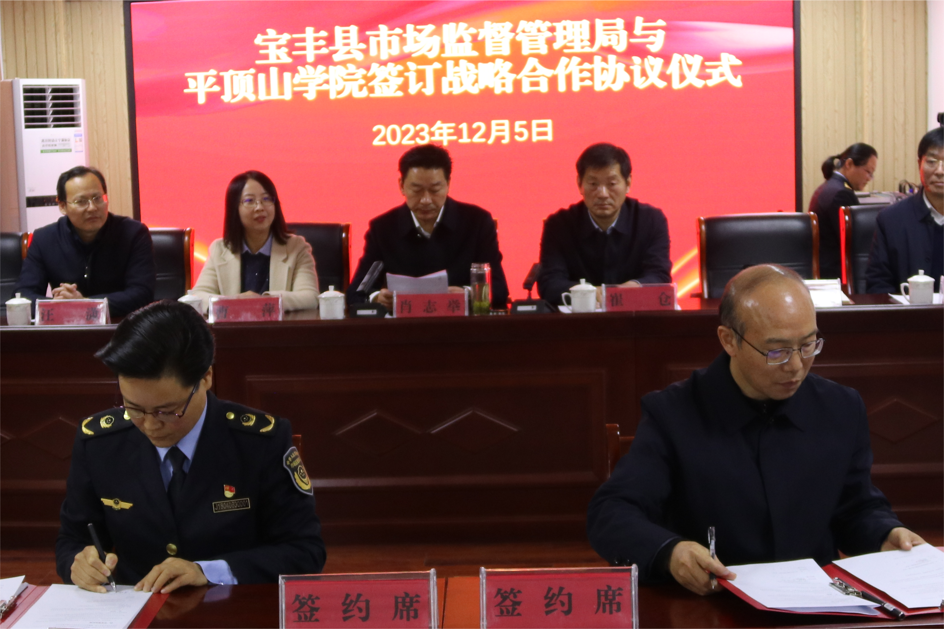 院长张振江与宝丰县市场监督管理局党组书记、局长王晓丽签订战略合作协议。根据协议,双方将在人才培养、科学研究、行业师资建设、服务社会等方面进一步加强合作,实现共赢。