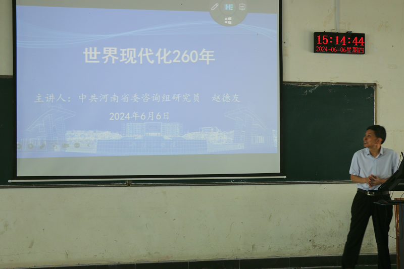 6月6日下午,中共河南省委咨询组研究员赵德友博士应邀到我校作题为《世界现代化26年》的专题辅导报告。太阳成集团tyc7111师生代表300余人参加报告会。报告会由太阳成集团tyc7111院长张振江主持。