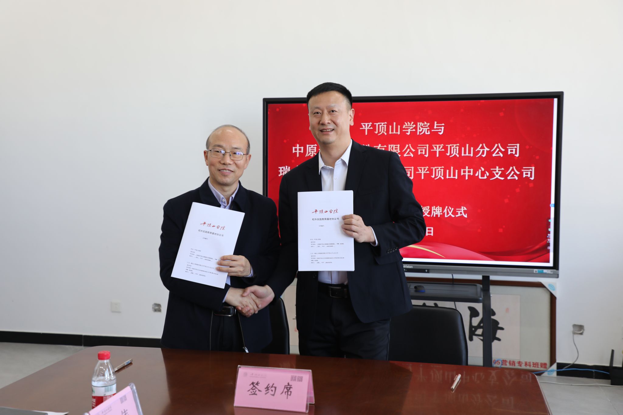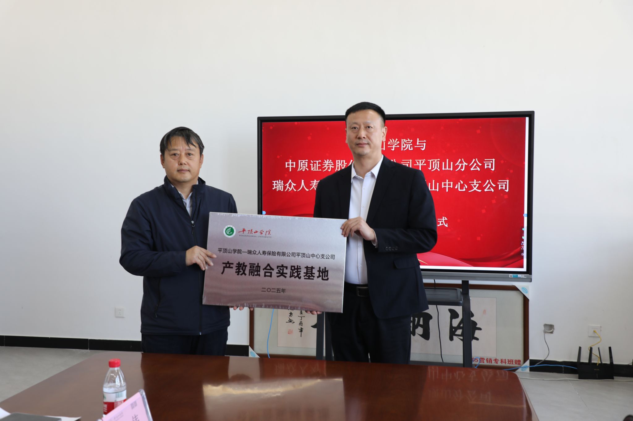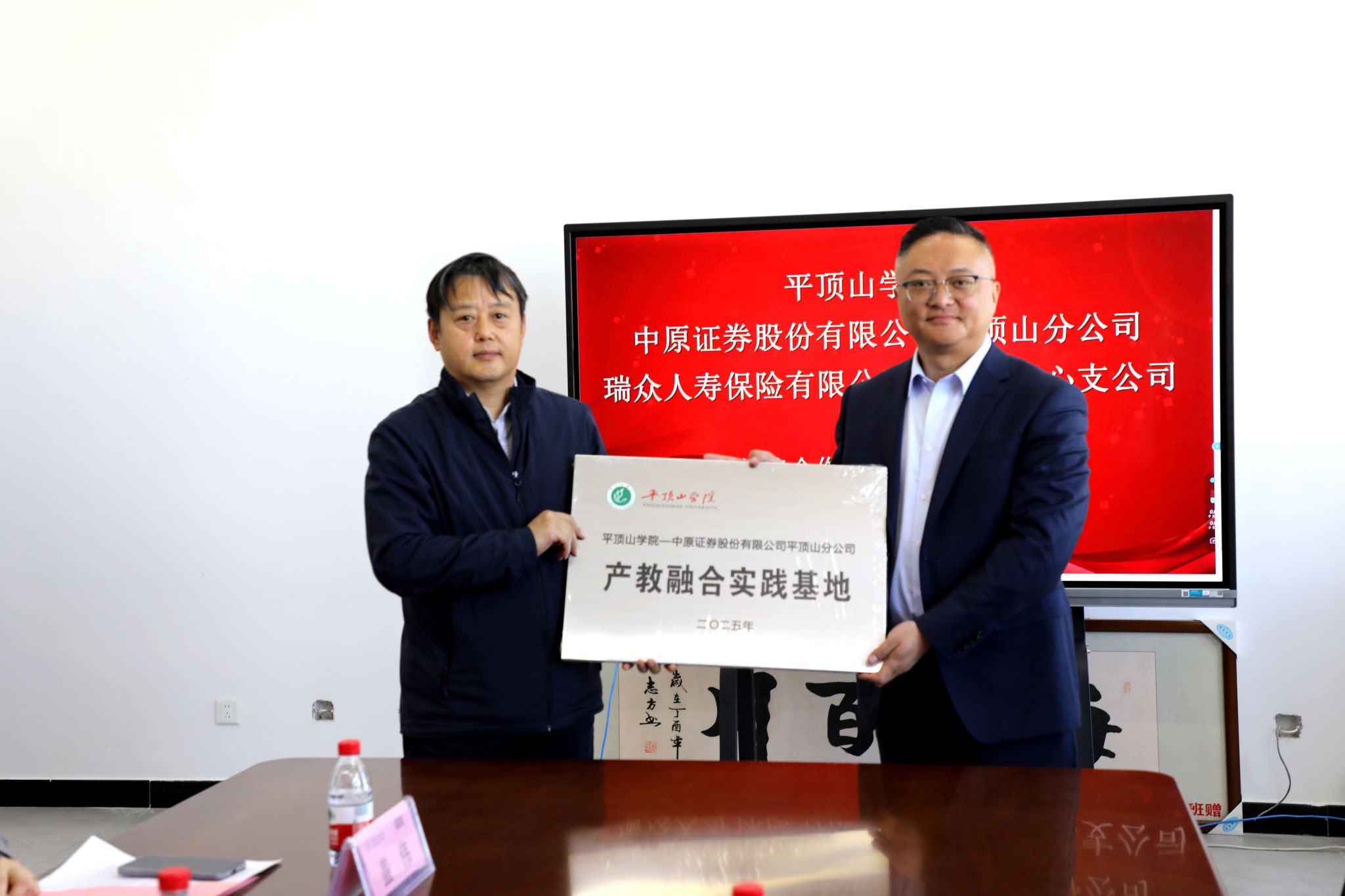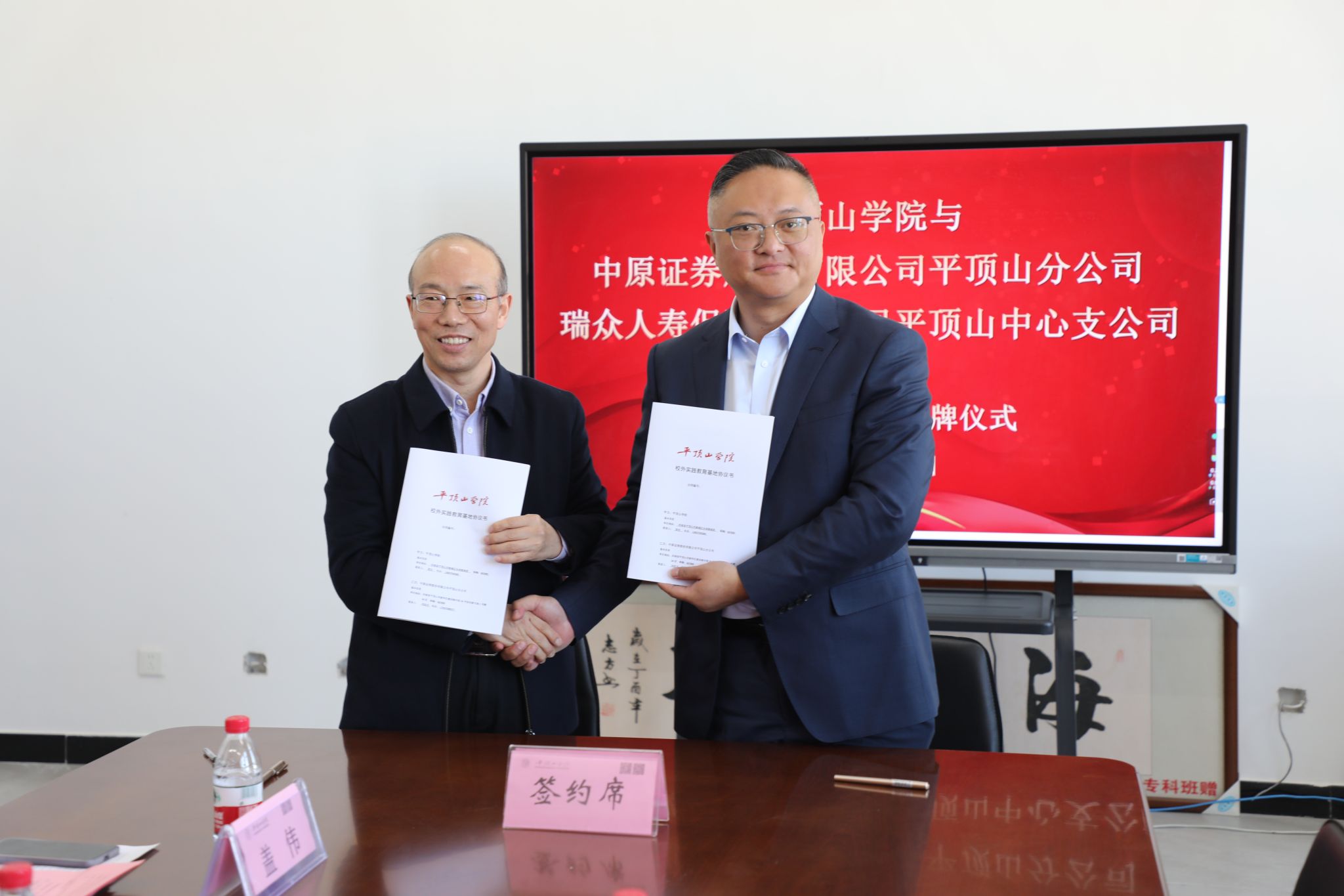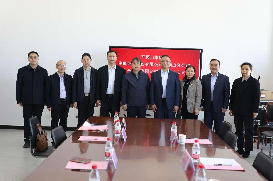 2025年3月20日下午2点,我院与中原证券股份有限公司平顶山分公司、瑞众人寿保险有限公司平顶山中心支公司战略合作签约暨授牌仪式在行知楼RB422举行。此次活动标志着学院在深化校地、校企合作,促进教育链、人才链与产业链有机衔接方面迈出了重要一步。