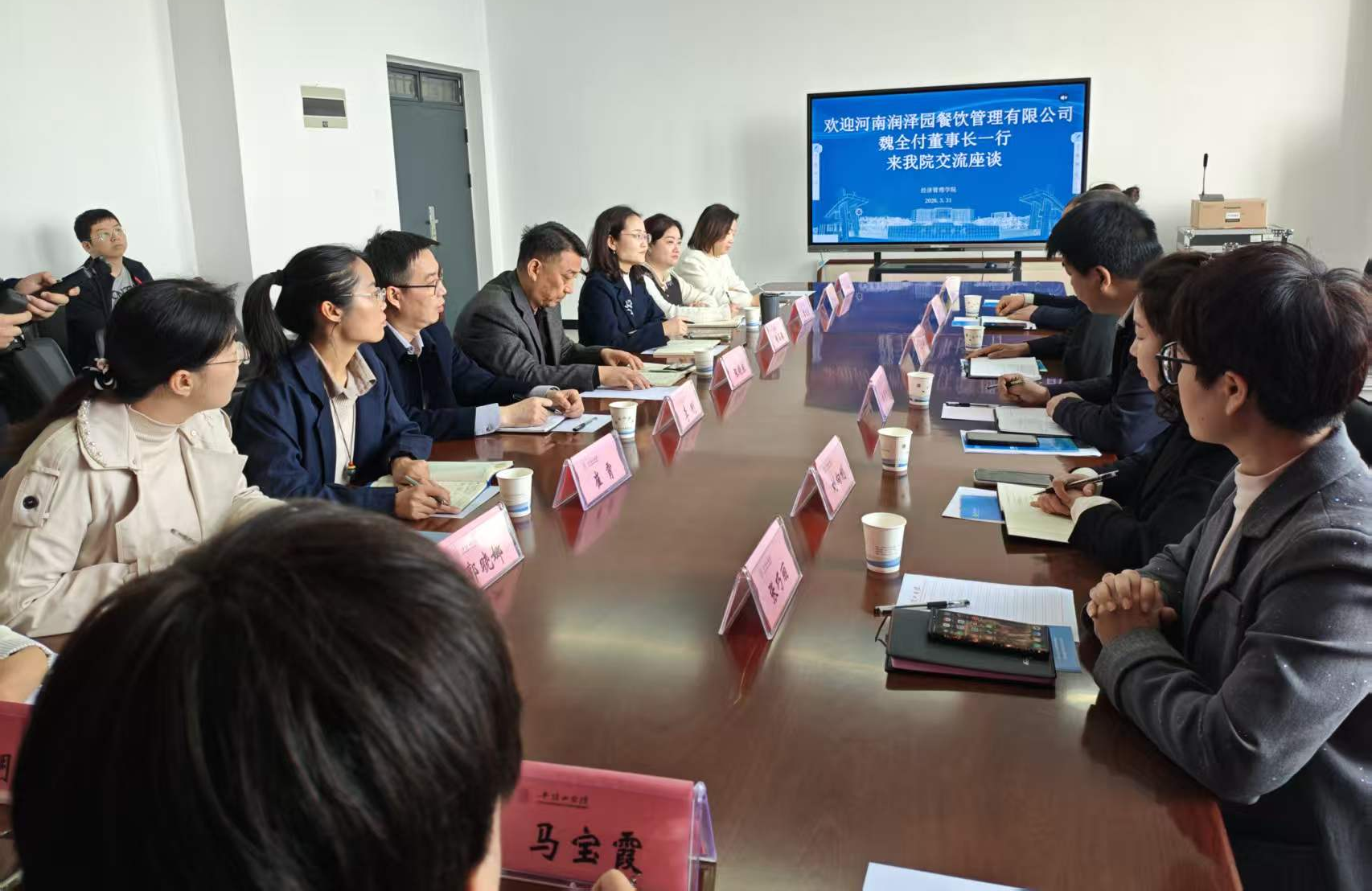 3月31日上午,河南润泽园餐饮管理有限公司董事长魏全付一行6人到太阳成集团tyc7111开展校企合作交流座谈。太阳成集团tyc7111院长杨玉敬、党委副书记李刚,法学院院长张晓东及相关专业教师参加座谈。