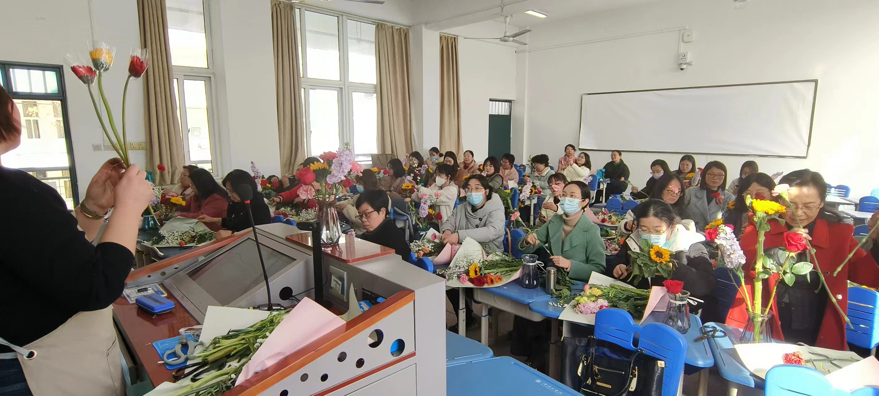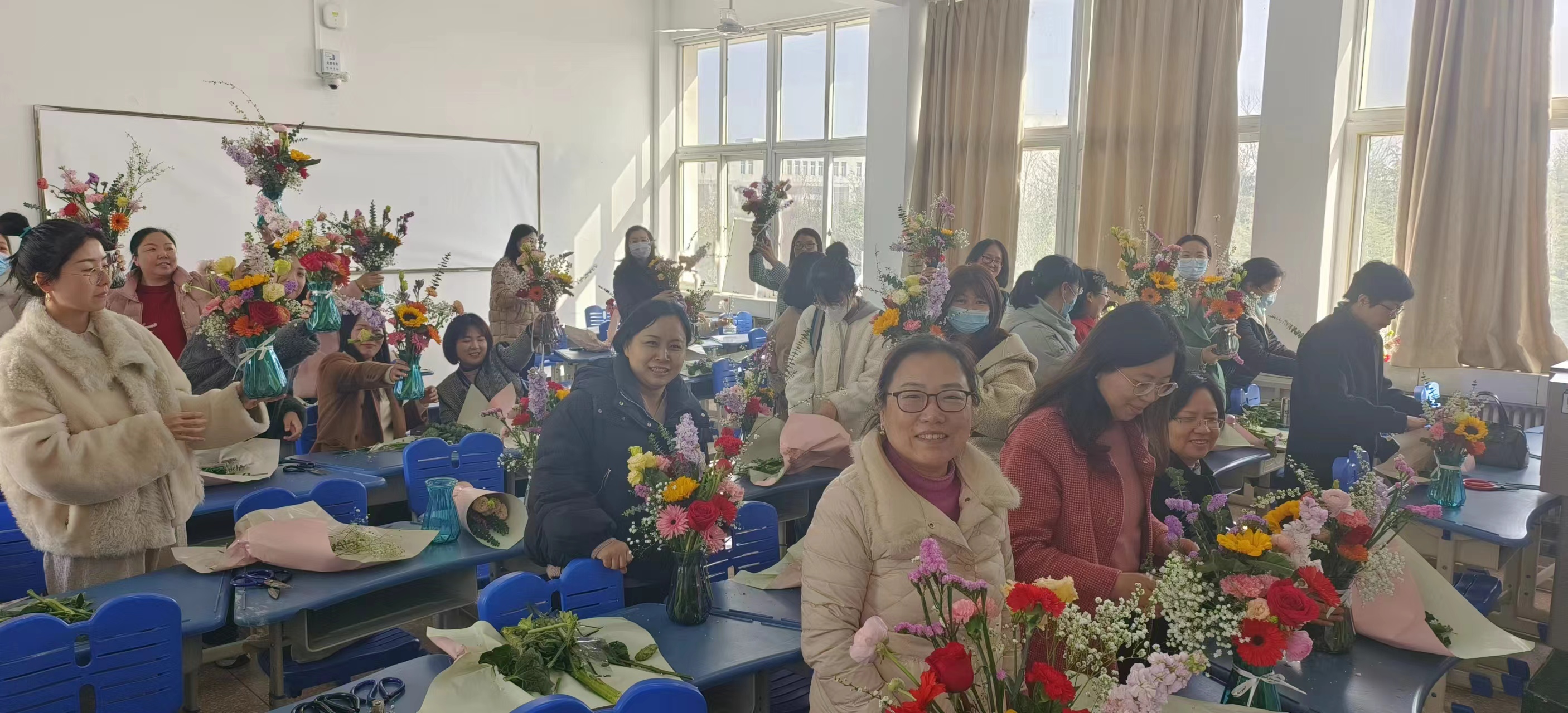 为迎接“三八”国际劳动妇女节,进一步丰富女教工精神文化生活,营造欢乐温馨的节日氛围,3月7日下午,太阳成集团tyc7111分工会在教学楼2203教室组织开展了插花实践活动,共有近40名女教职工积极参与,共享了一段花间品香的专宠时光。