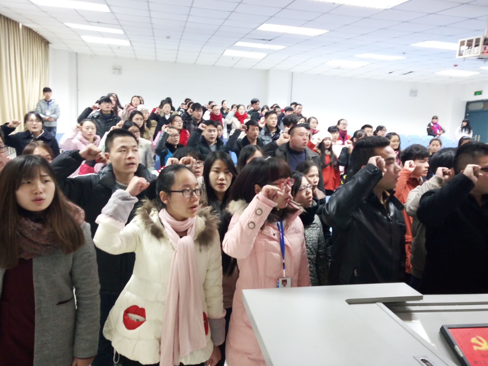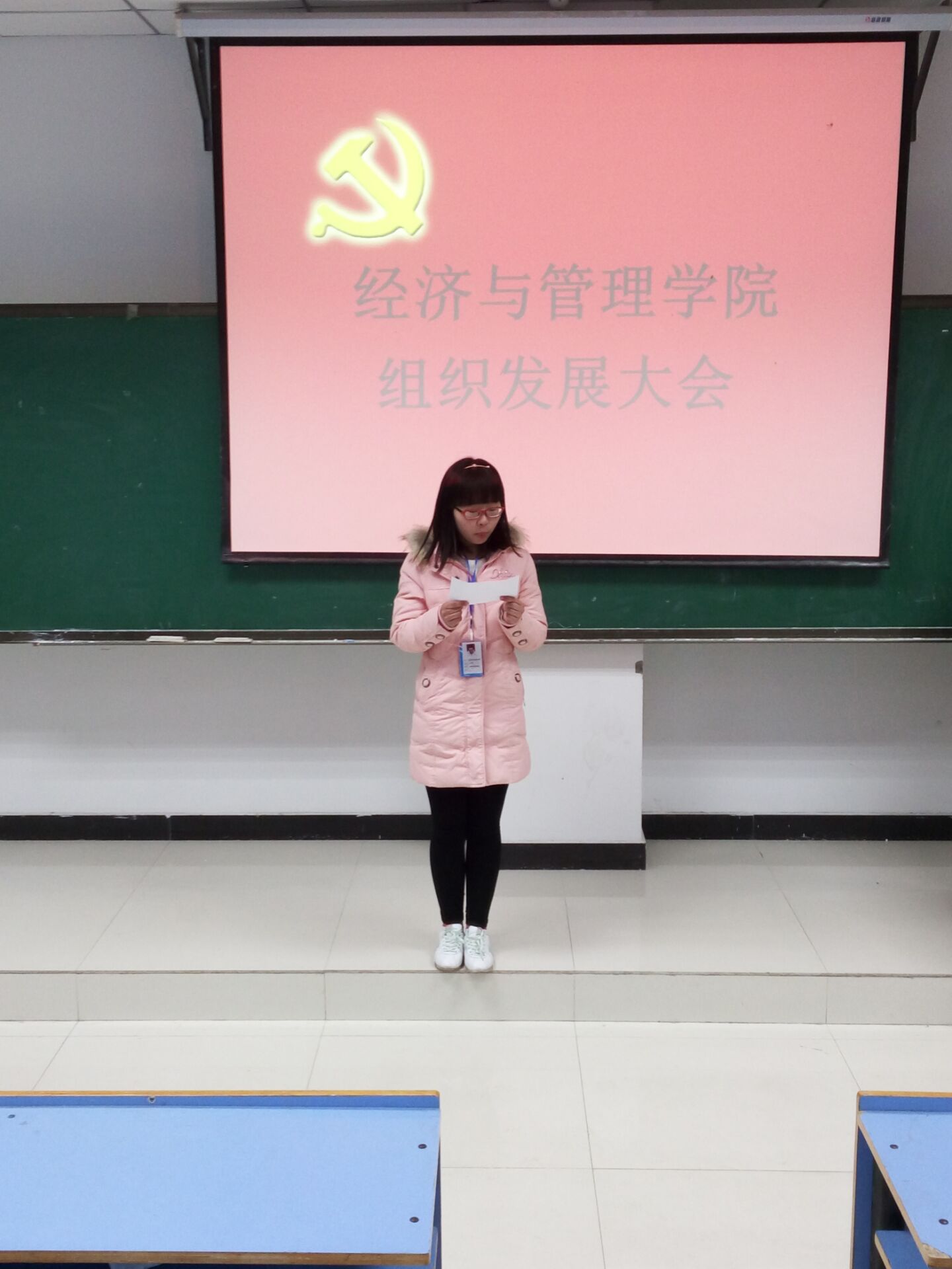 大会第一项,与会所有成员起立奏唱《国歌》,随后47名发展对象逐一介绍了自己在积极分子期间的表现,并对组织表态。由第一培养人介绍申请人的主要情况,并对其能否入党表明意见,由第二培养人对发展对象能否入党表明意见。与会正式党员进行匿名投票表决并在会场进行统计及宣布投票结果,最后张磊老师宣读支部大会决议并带领全体新党员庄严宣誓。