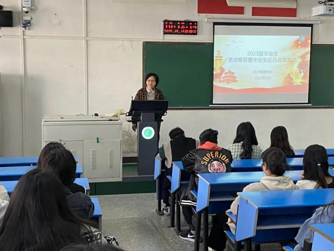 活动中,刘书记表示,入伍是大学生振国立业两不误的最优选项,在同学们履行保卫祖国神圣义务的同时,军营更是实现人生梦想最好的舞台。她指出党和国家高度重视国防和军队建设,通过近些年深化改革发展,我们的军队建设实现了凤凰涅槃跨越式的进步,国家发布了把“人才引进”和“带岗入伍”有效衔接的新政策,应届大学毕业生将以人才三进的方式“秒批”报名优先,她希望同学们可以把握这个机会,为国效力。