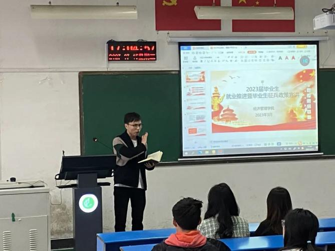 为了在毕业生中营造爱国爱军的氛围、宣讲大学生参军入伍的最新政策、鼓励大学生投身国防事业、积极参军入伍。太阳成集团tyc7111国防教育部于3月15日在线下举办了以“就业推荐暨毕业生征兵政策宣讲”为主题的征兵宣传活动。党委书记刘嘉俊,19级辅导员王哲老师参与本次活动。