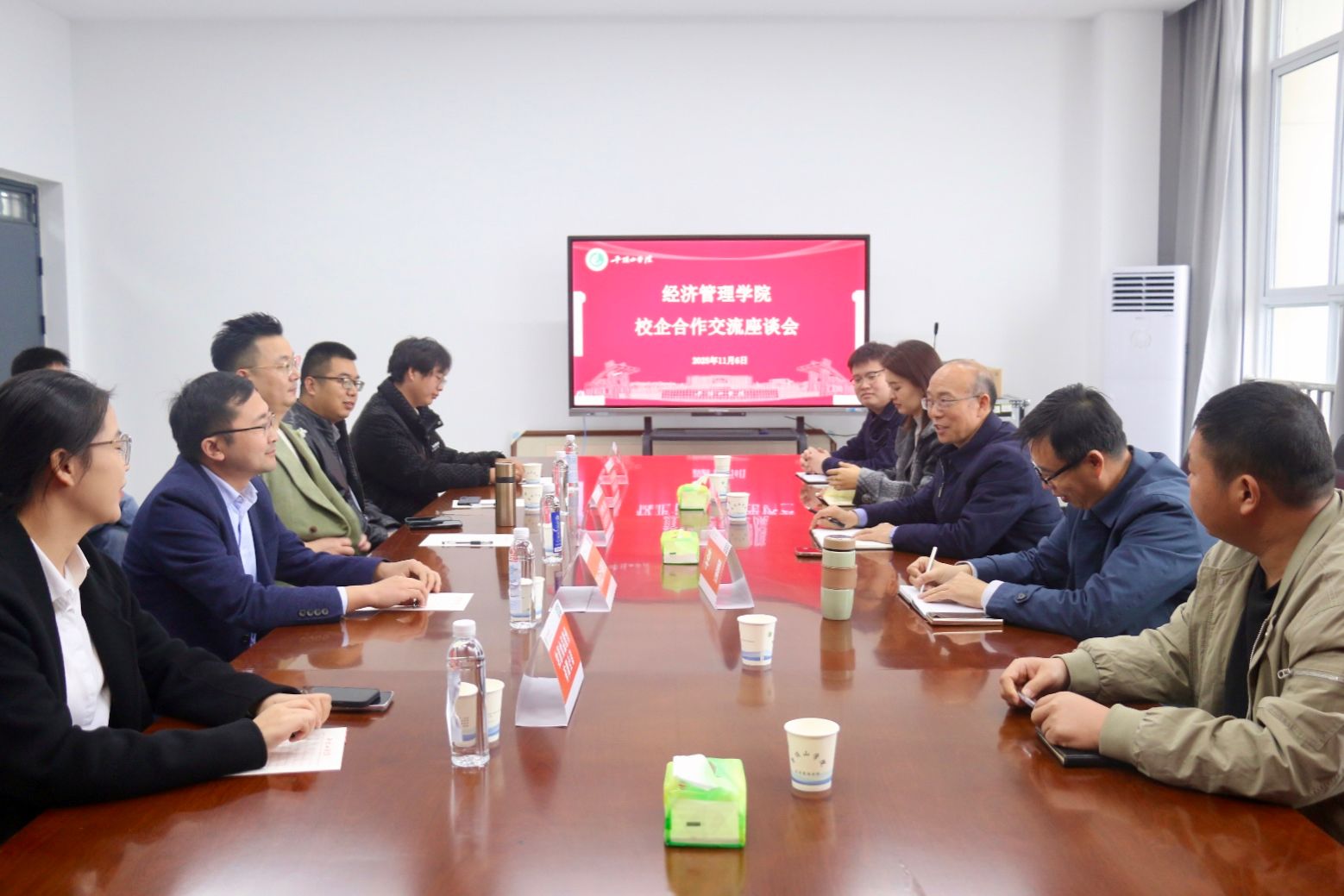 双选会后,我院于行知楼RB422会议室举办校企合作交流座谈会,将双选会现场的合作意向转化为务实磋商。牧原食品股份有限公司、平顶山正大有限公司、平顶山灵煜商贸有限公司、浙江卓毓网络科技有限公司、郑州明心网络科技有限公司五家企业负责人应邀出席,涵盖农牧、商贸、网络科技等重点领域,共话合作发展路径。