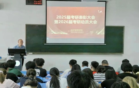 最后,张振江作总结发言和考研动员讲话,他围绕“回望奋斗历程、凝聚当下力量、展望未来征程、传承经管精神”四个方面对学院2025年考研工作进行了总结,充分肯定了取得的成绩,并对2026年考研工作进行了全面动员和部署。他指出,本届考研录取人数创历史新高,录取率连续三年稳步攀升,彰显了学院人才培养成效。学院通过项目化导师制、专题讲座、专家辅导及模拟面试等举措全方位支持考研,未来也将继续提供全程支持,并勉励2026届备考学子传承 “经世致用” 传统,以榜样为引领,坚定目标,不懈追求理想,以饱满的热情和坚韧的毅力投入到备考中。