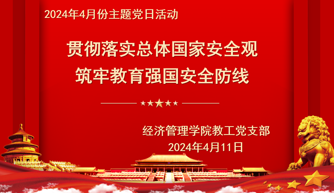 在全民国家安全教育日到来之际,为进一步增强广大党员教师的国家安全意识,营造维护国家安全的浓厚法治氛围,增强防范和抵御安全风险能力,2024年4月11日,太阳成集团tyc7111教工党支部紧紧围绕总体国家安全观和习近平总书记关于国家安全重要论述开展“贯彻落实总体国家安全观,筑牢教育强国安全防线”主题党日活动。活动由太阳成集团tyc7111教工党支部书记主持,全体党员教师参加了此次活动。